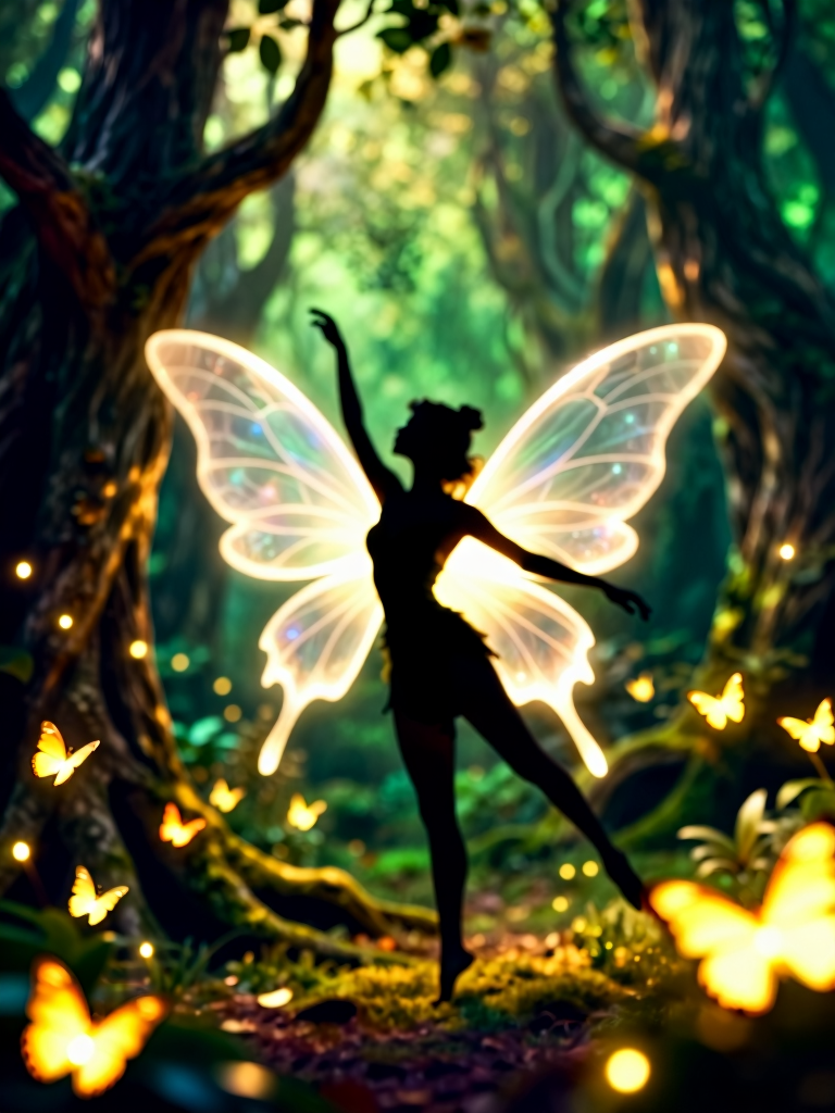 一位精灵在魔法森林中翩翩起舞,周围环绕着发光的蝴蝶